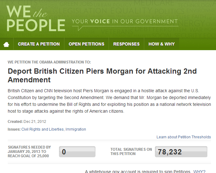 CNN Host Piers Morgan has more to be thinking about these days than just his horrible ratings. A petition sprang up last week in favor of deporting the U.K. Citizen for his attacks on the 2nd as well as his pointed tweets, including his apparent happiness over the Sandyhook shootings that left 26 dead. At the time of this article, his petition has eclipsed the 25,000 needed to require a Whitehouse response.
